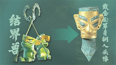 “卷鼻子”结界兽造型除了融合戴金面罩青铜人头像、青铜大面具的元素外,还借鉴青铜纵目面具、三星堆青铜鹰形铃的特点。